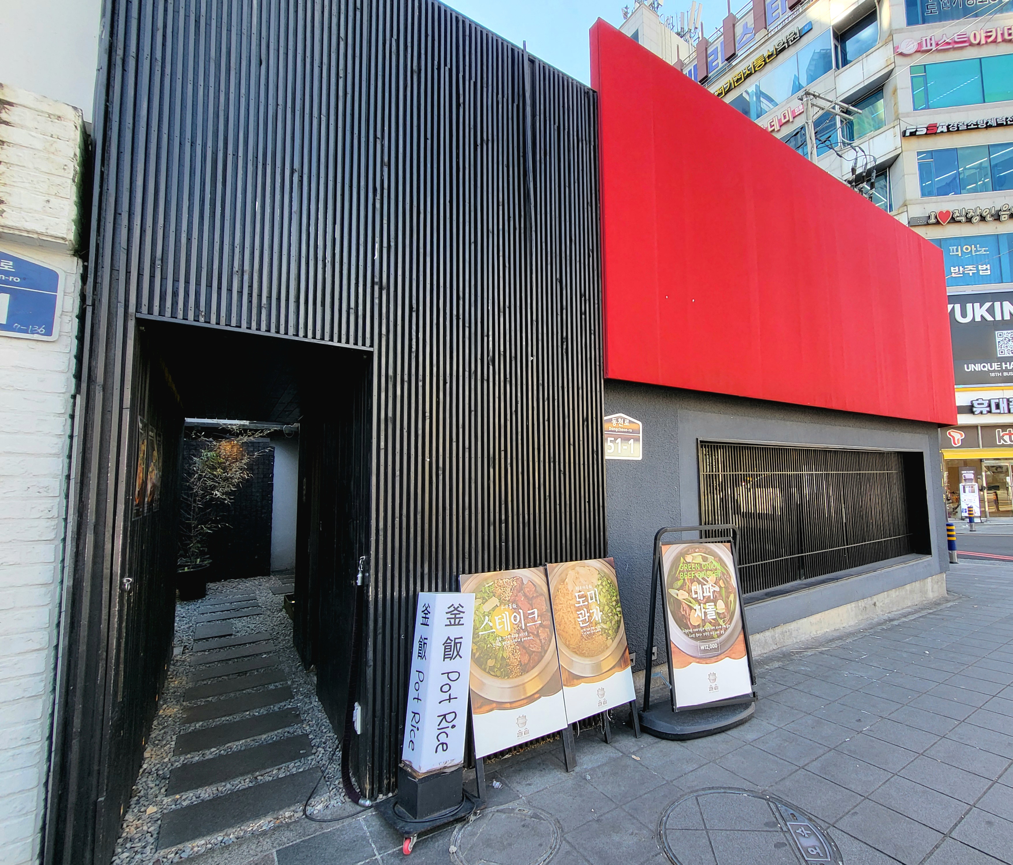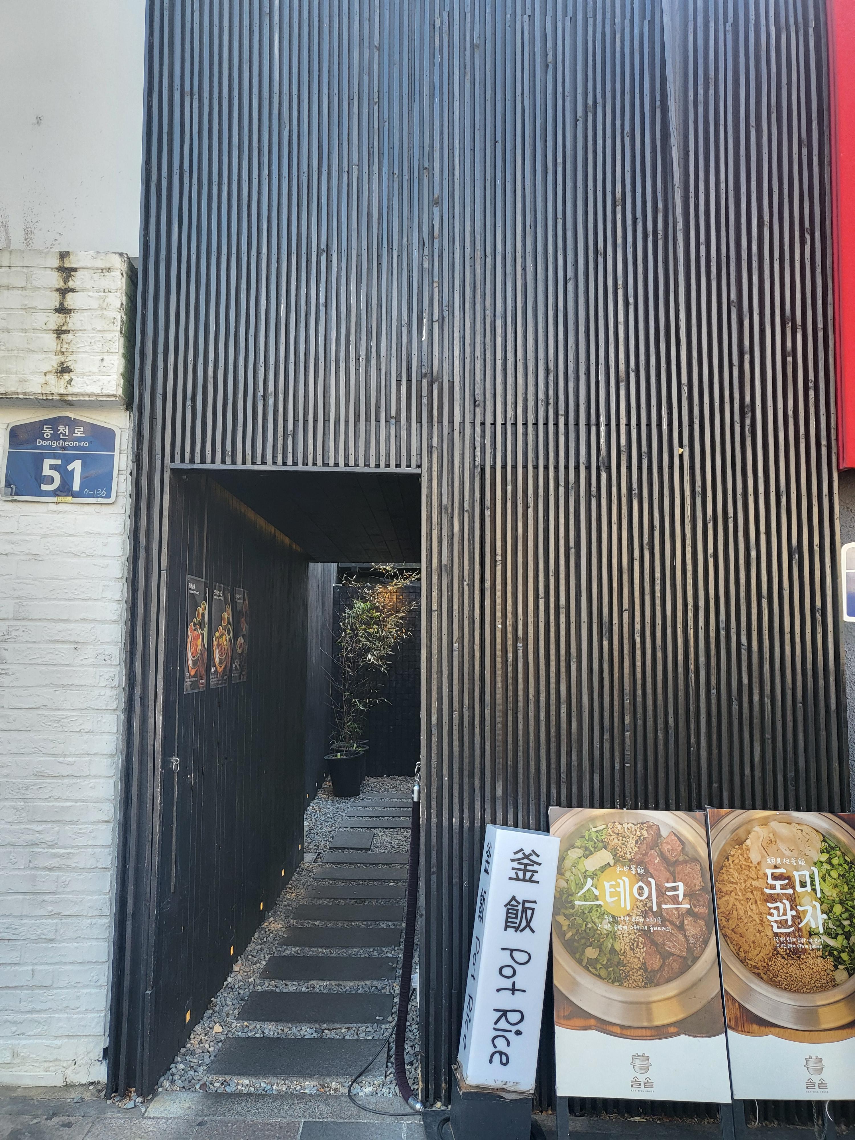 골목 안에도 역시나 간판이 없어서 다시 돌아 나왔습니다. 여기가 아닌가 싶어 다른 입구와 솔솥 간판을 찾았지만 없었습니다. 유일한 입구는 좁은 골목길이었습니다. 문을 열고 들어가니 창가로 안내해 주었습니다. 밖에서 우리가 서성거렸던 그곳이었습니다.