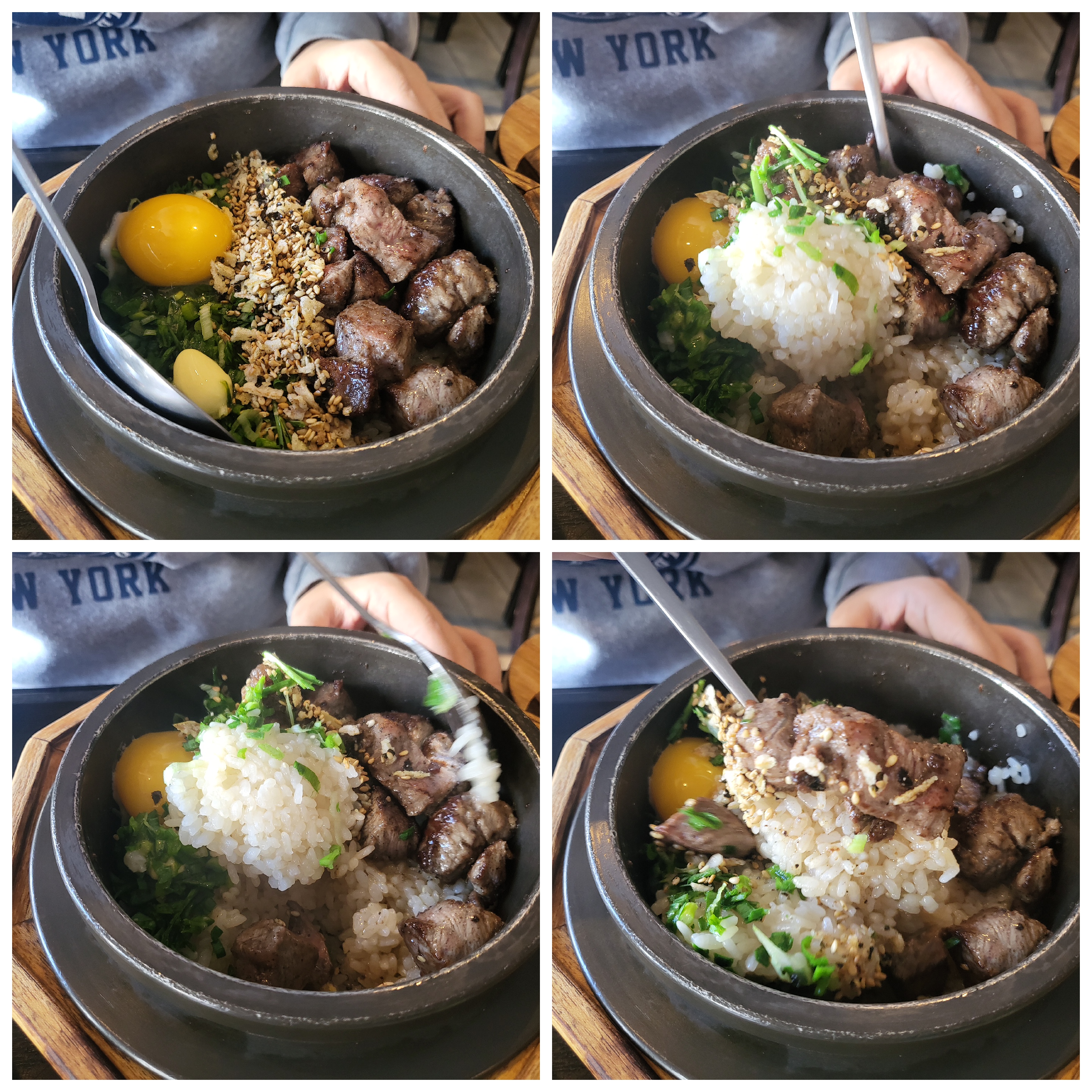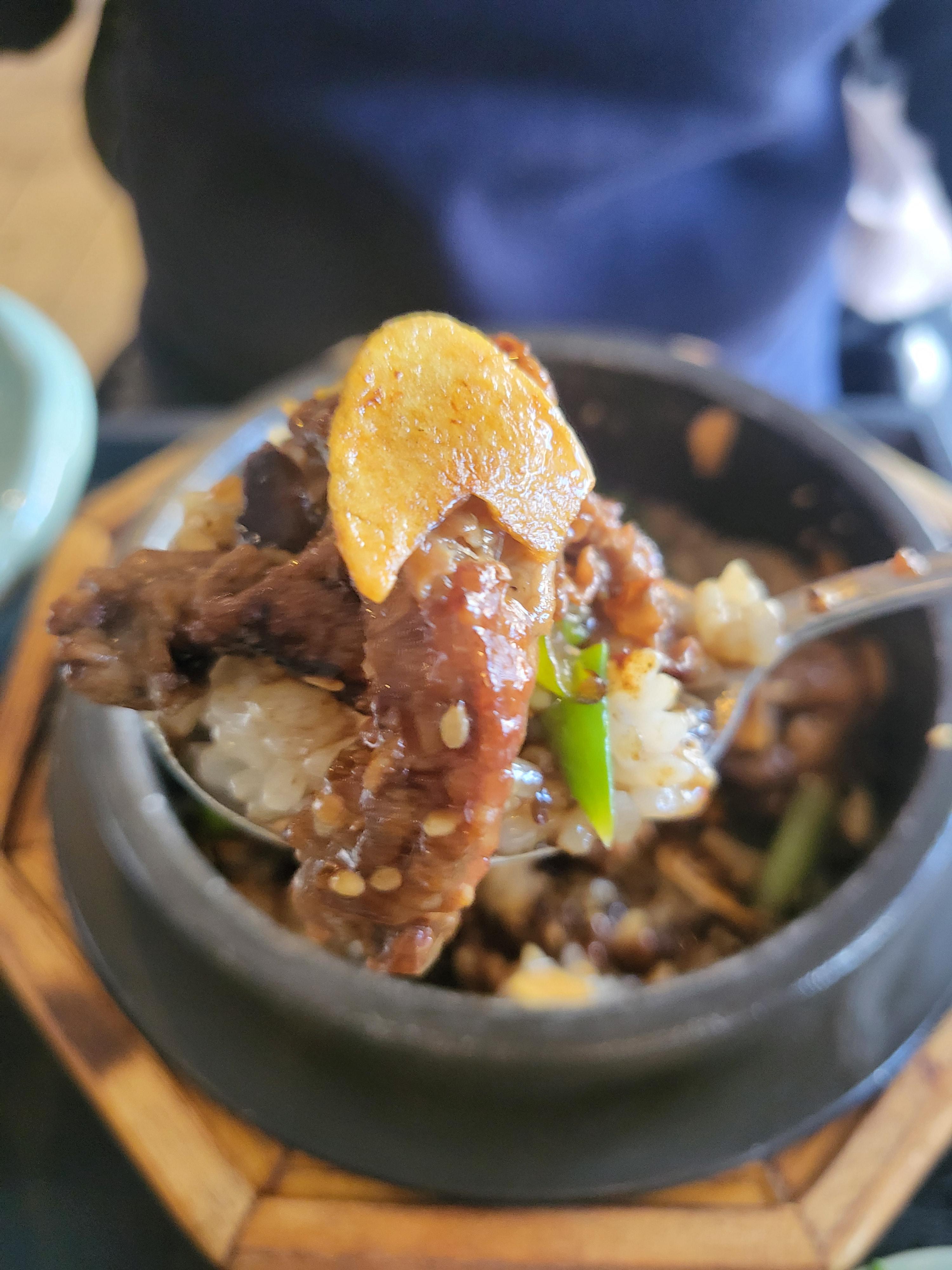 밥 반, 고기 반 같았습니다. 저는 비비면서 까무잡잡한 양념을 한 스푼 넣고 비볐습니다. 짜지 않고 오히려 맛을 더욱 업그레이드 시켜줘서, 제 입맛에는 스테이크 솥밥보다 대파 차돌 솥밥이 훨씬 맛있었습니다.
