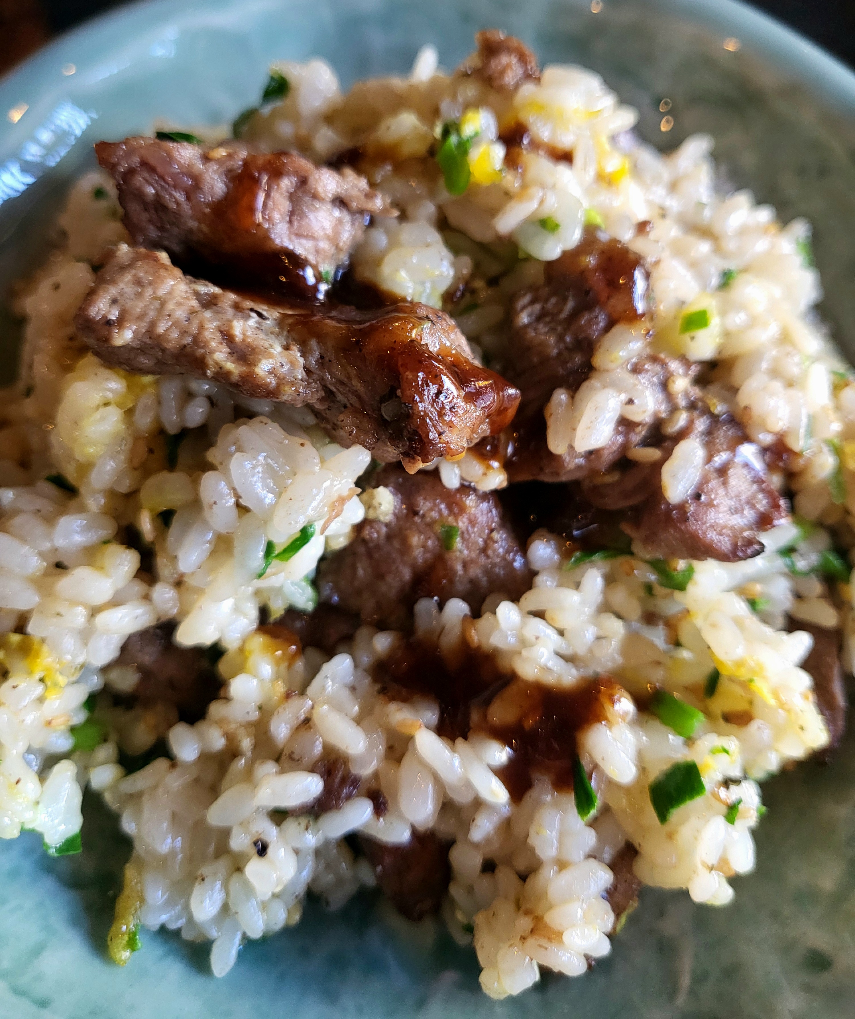 다음으로 대파 차돌 솥밥의 뚜껑을 열었더니 잘 튀겨진 마늘편이 노랗게 덮여 있었고, 그 아래로 양념된 차돌이 수북했습니다.