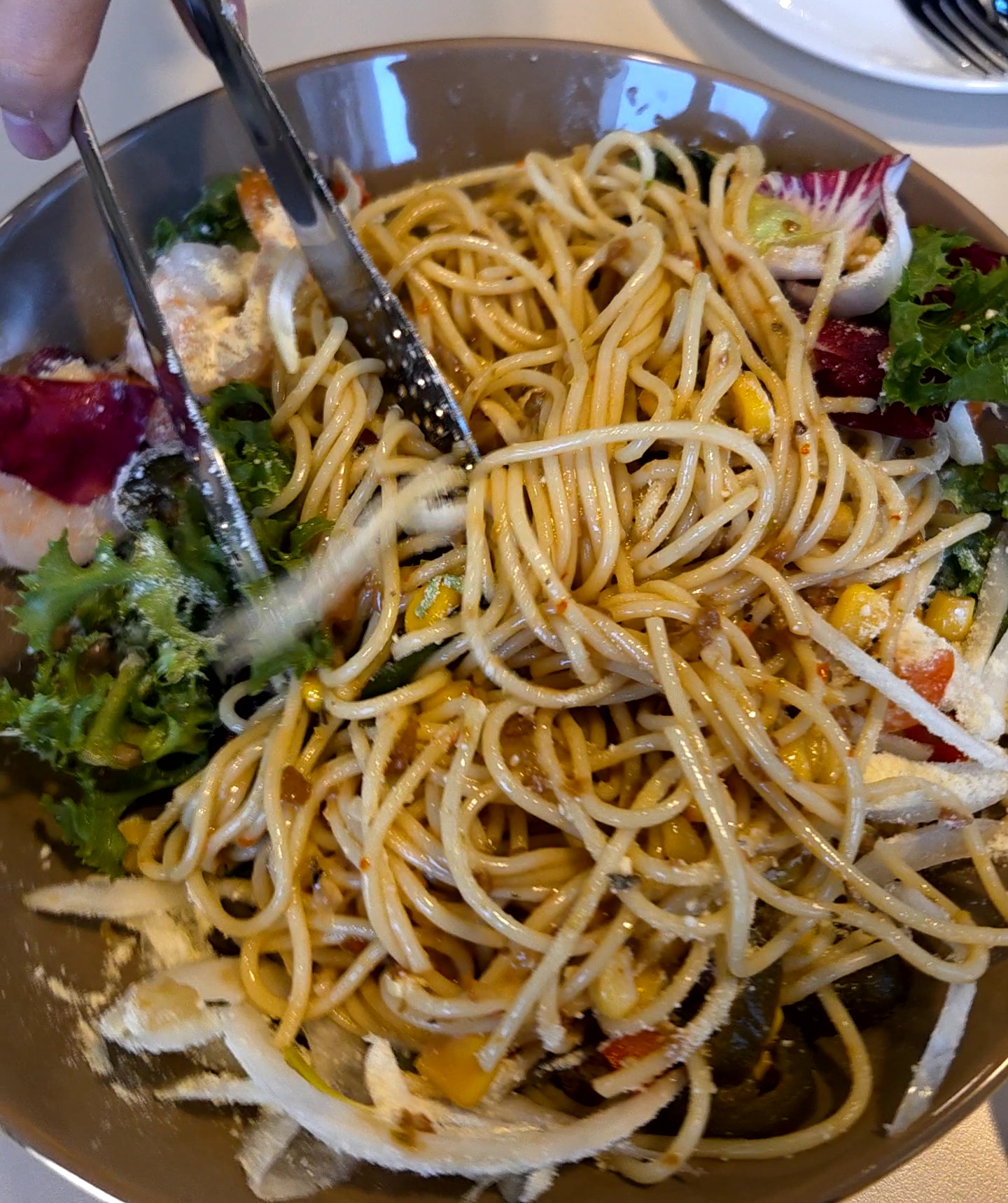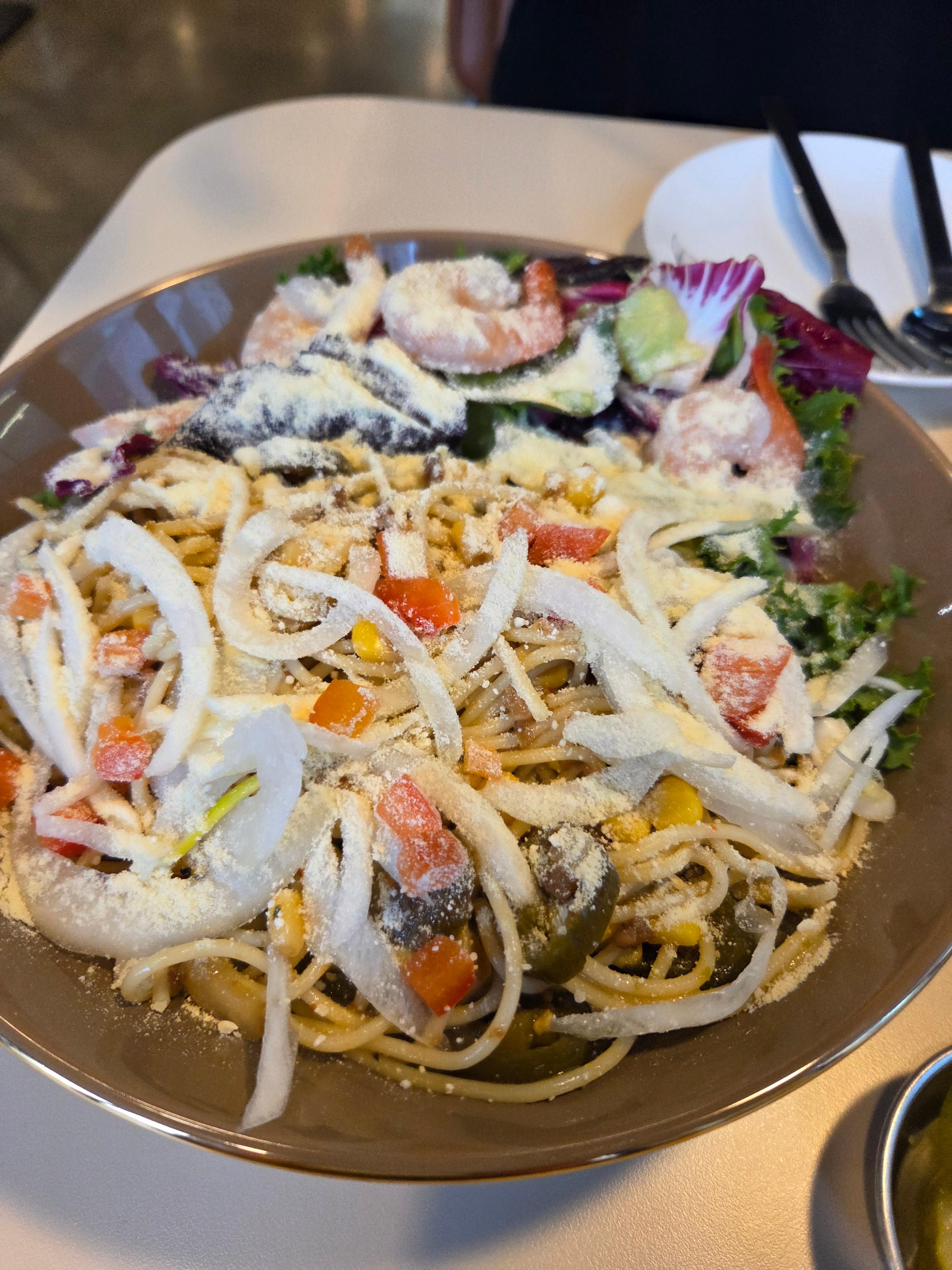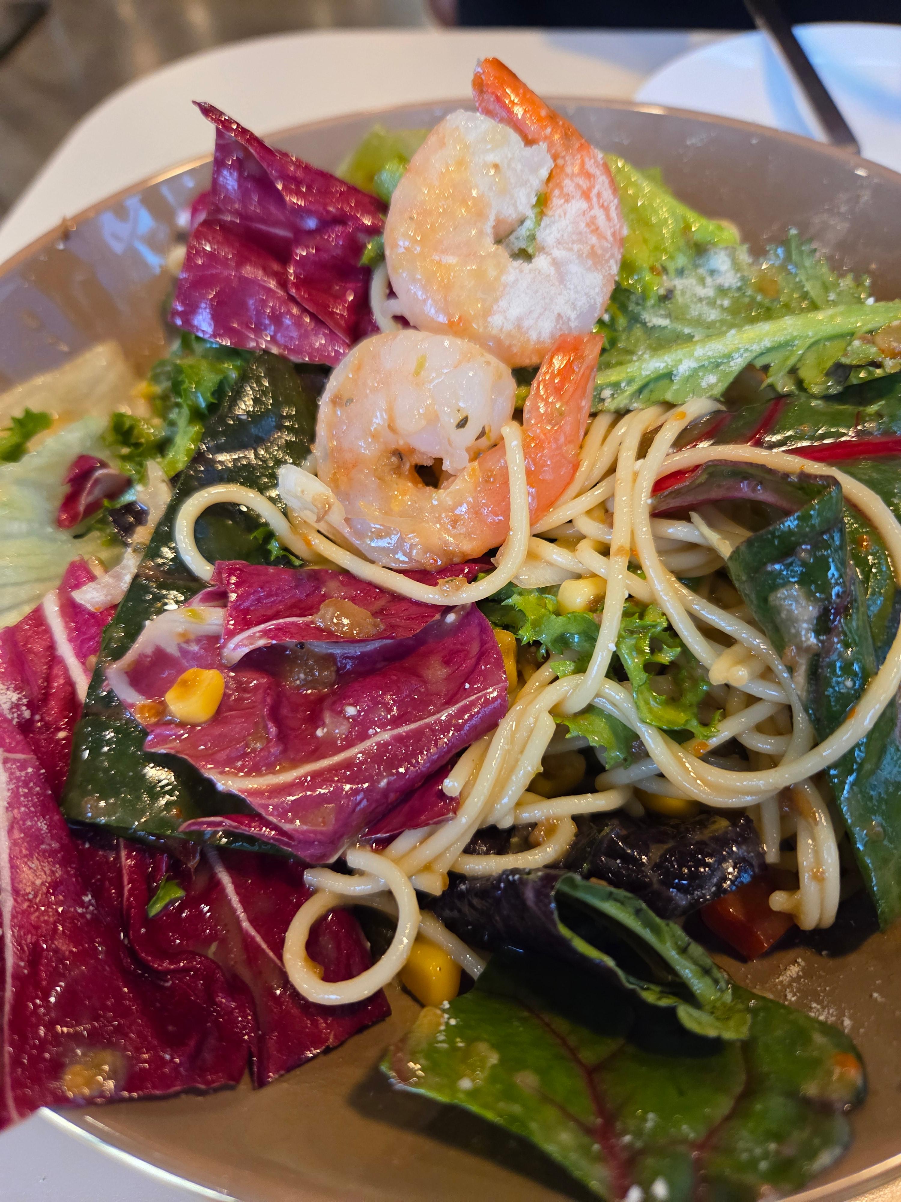먼저 새우 샐러드 스파게티.