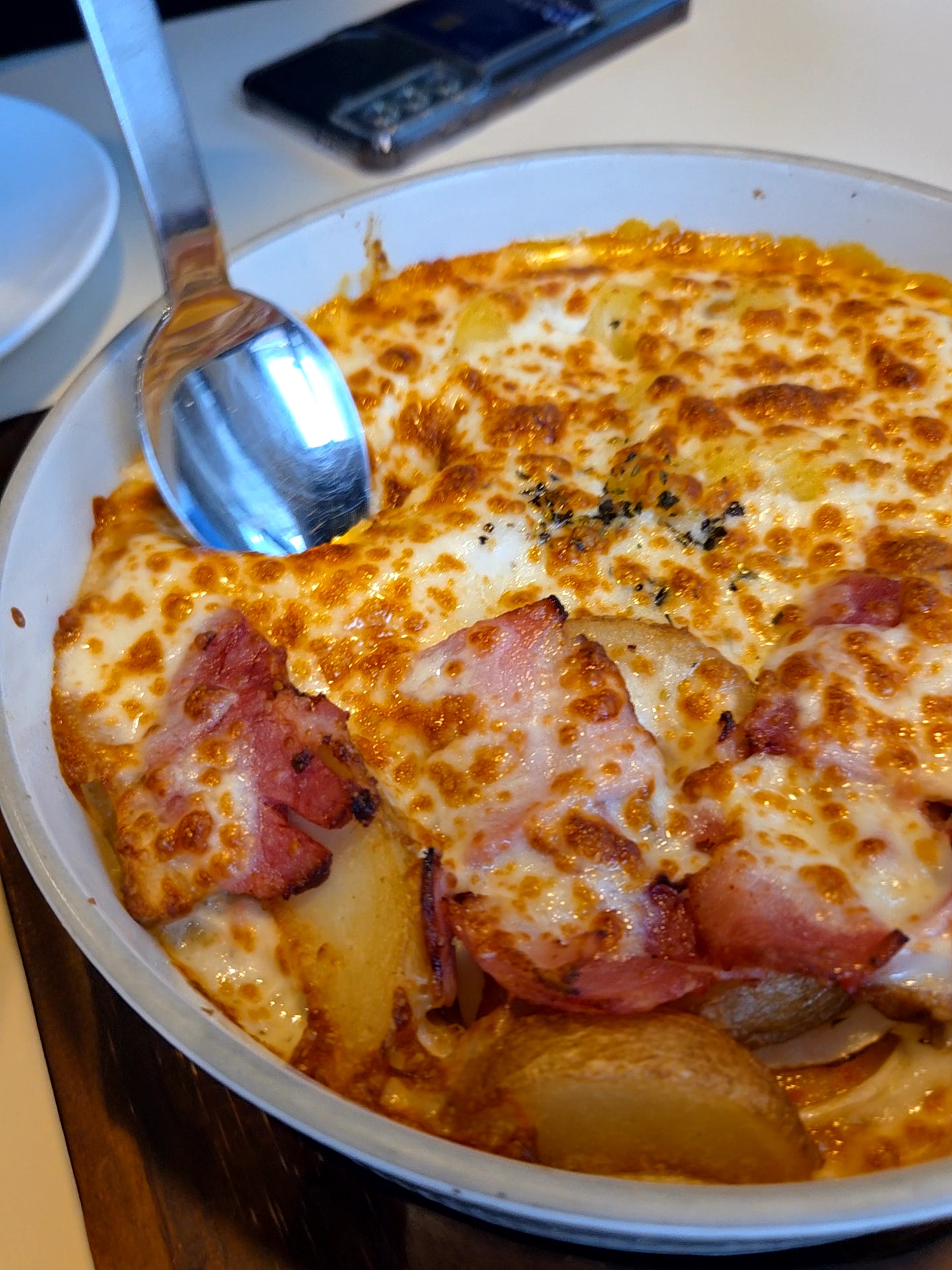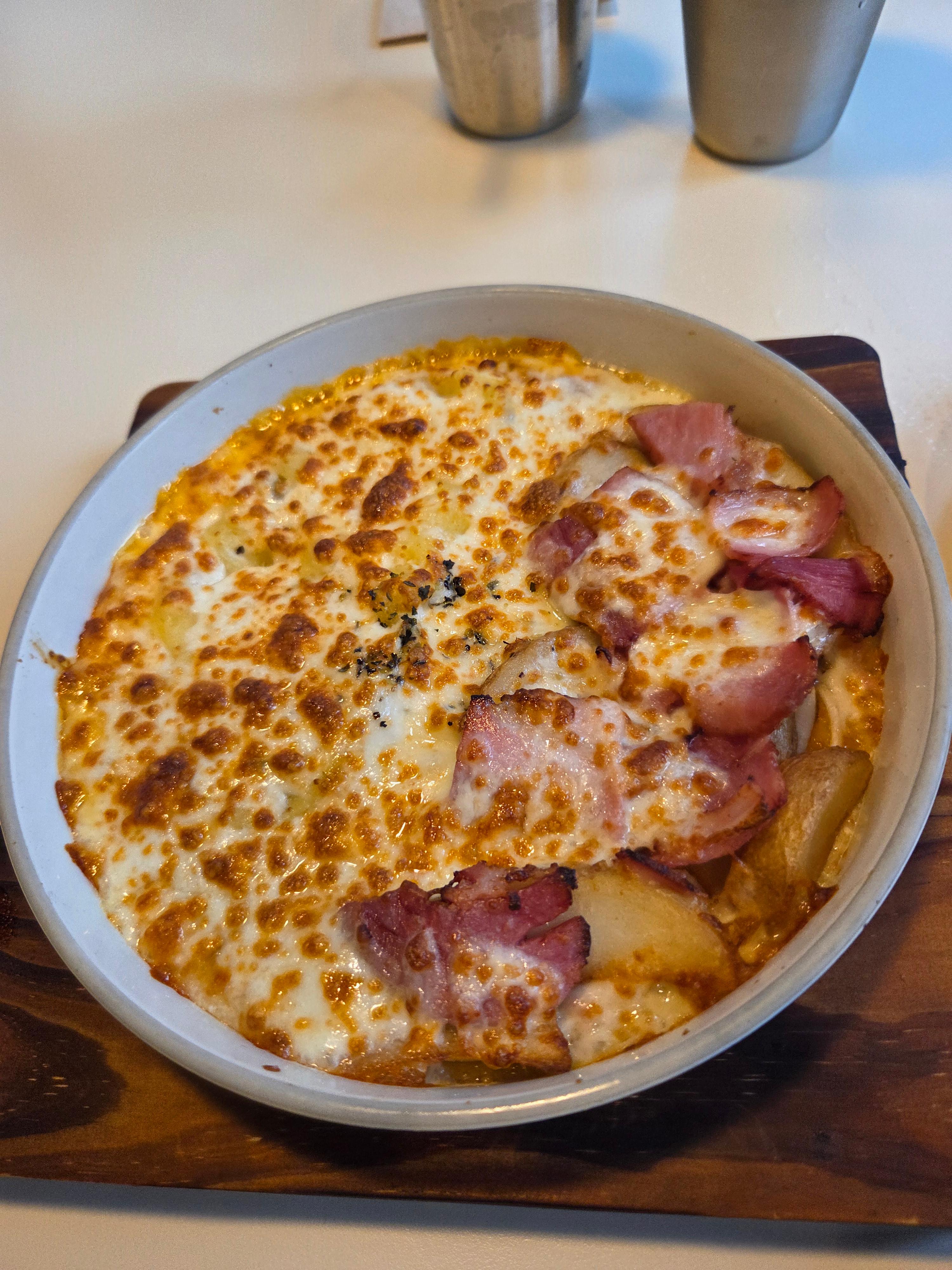 숟가락으로 퍼먹는 스타일이라 더 특별하게 느껴졌습니다. 바닥에는 부드러운 도우가 깔려 있었고, 뜨거운 도자기 그릇 덕분에 모짜렐라 치즈가 쭉쭉 늘어나는 비주얼이 식욕을 자극했습니다.