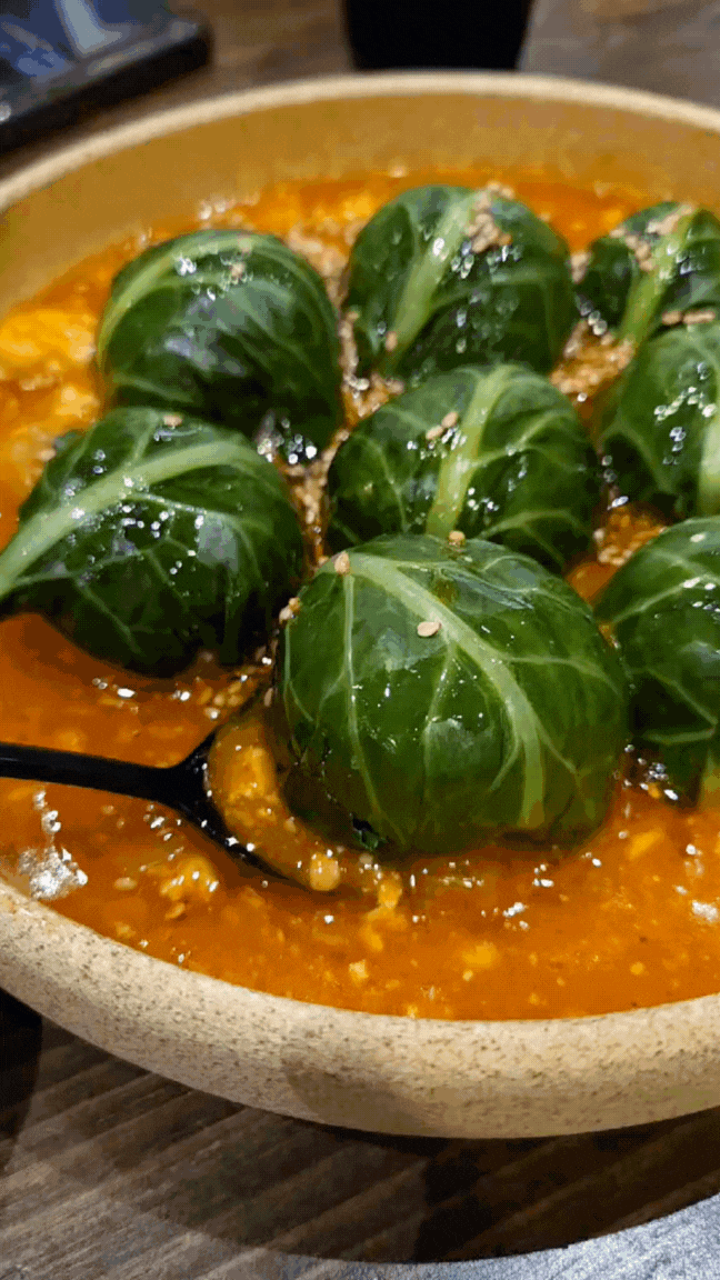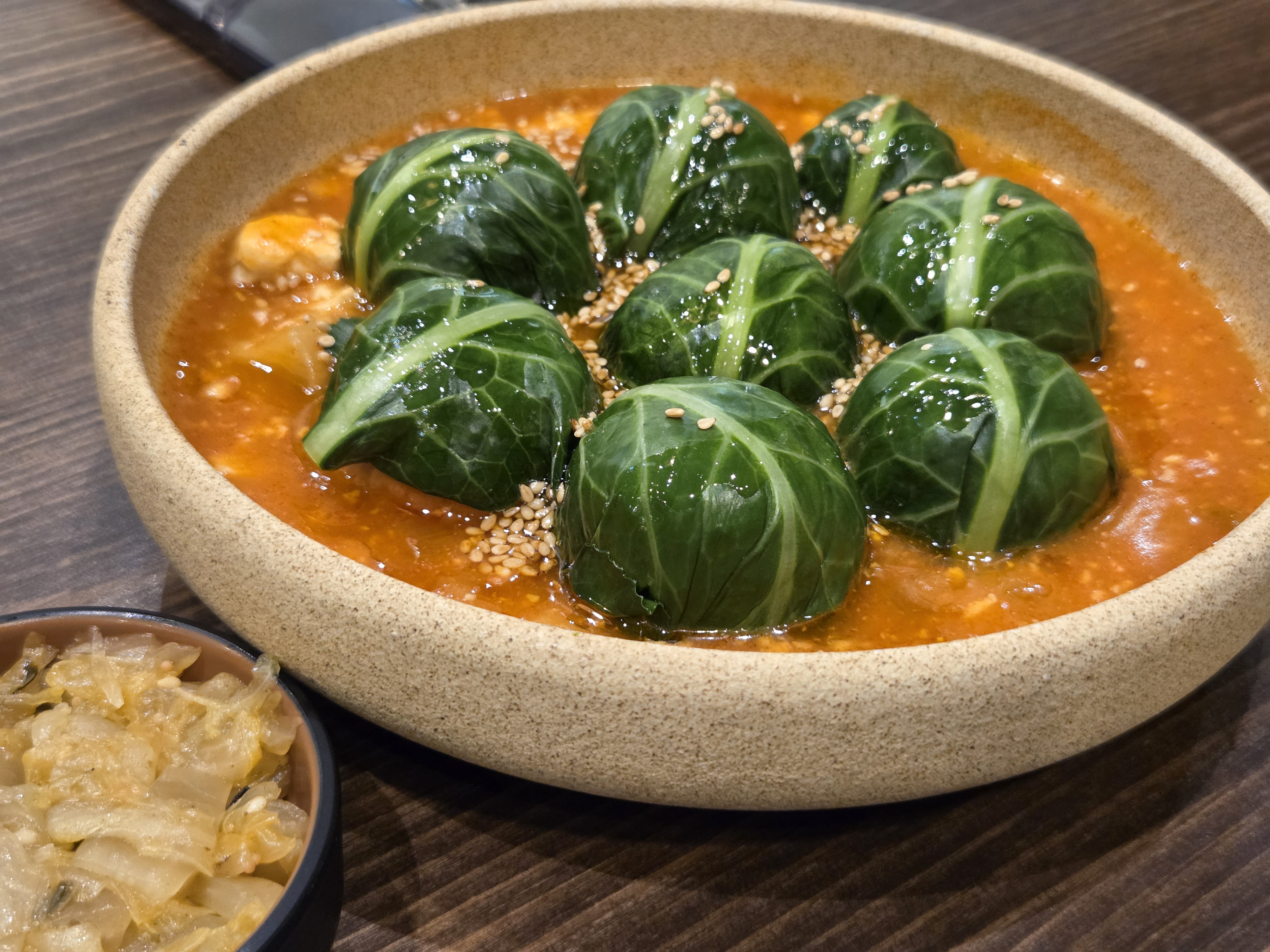 조금 기다리니 먼저 나온 것은 강된장 케일 쌈밥이었습니다. 소고기와 들기름을 넣어 비빈 밥을 데친 케일로 감싸 깔끔한 한입 크기의 쌈밥을 만들고, 그 아래에 강된장 소스를 깔아 플레이팅한 모습이 참 예뻤습니다. 강된장의 맛이 지나치게 짜거나 강하지 않고 은은하게 감돌아, 케일쌈밥과 조화롭게 어우러졌습니다. 한입에 쏙 넣고 씹으면, 강된장과 구수한 들기름의 향이 입안에 퍼집니다. 함께 나온 새콤한 묵은지 볶음을 곁들여 먹으면 또 다른 맛이 느껴져 더욱 좋았습니다. 건강한 맛을 추구하는 분들에게 추천하고 싶은 메뉴였습니다.