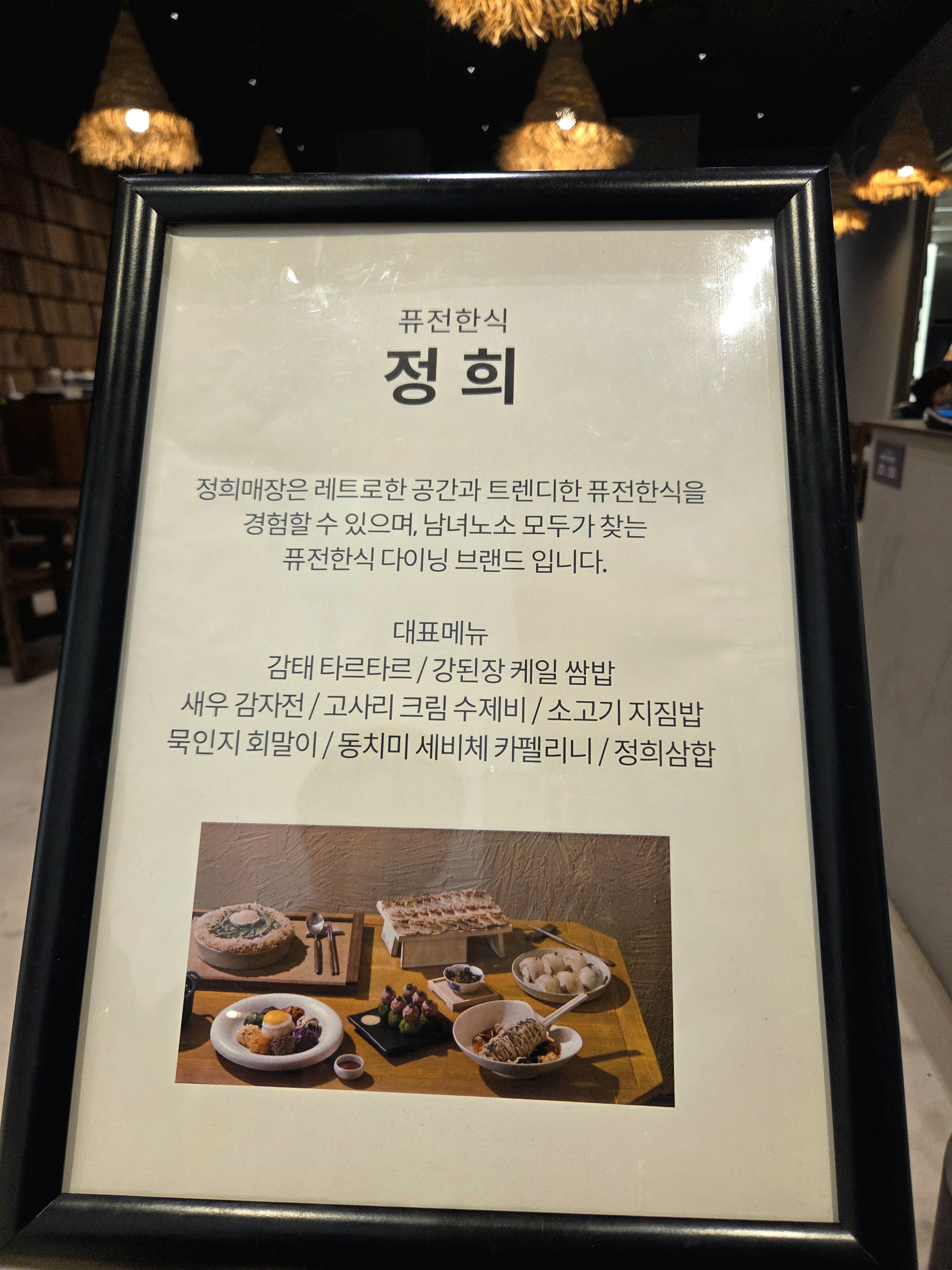 이번에 방문한 곳은 새롭게 생긴 퓨전한식 다이닝 브랜드, ‘정희’입니다. 이름부터 정감 가는 이곳은 레트로한 감성과 현대적인 감각이 어우러진 공간으로, 퓨전한식을 경험할 수 있는 곳이라고 합니다. 입구부터 아늑한 분위기가 물씬 풍겼고, 좌석에 앉아 메뉴를 살펴보았습니다.