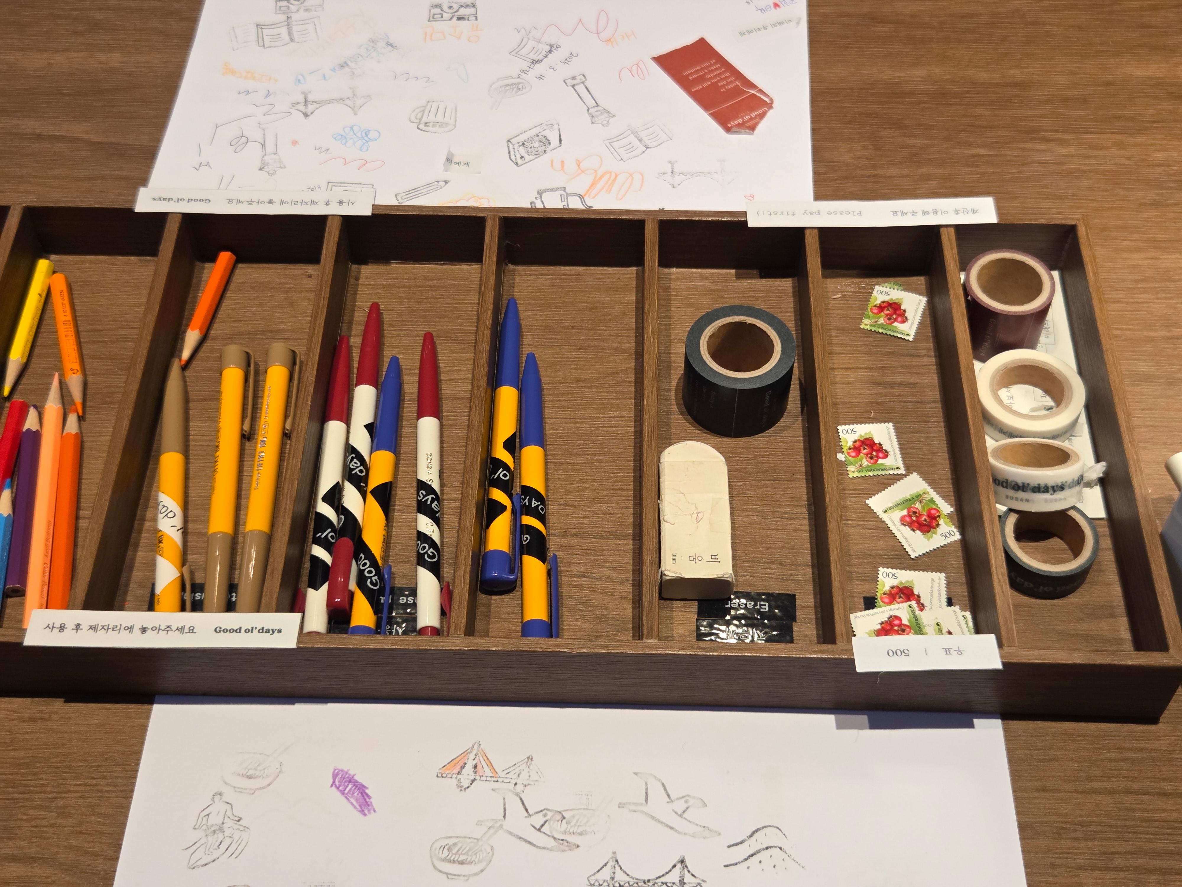 카페에 들어서자마자 눈길을 끄는 것은 1층에 마련된 독특한 공간이었습니다. 카페 한쪽에는 다양한 스탬프가 마련되어 있었고, 누구나 자유롭게 엽서를 꾸며 우편을 보낼 수 있는 공간이 있었습니다. 마치 시간이 느리게 흐르는 듯한 따뜻한 분위기가 느껴졌습니다.