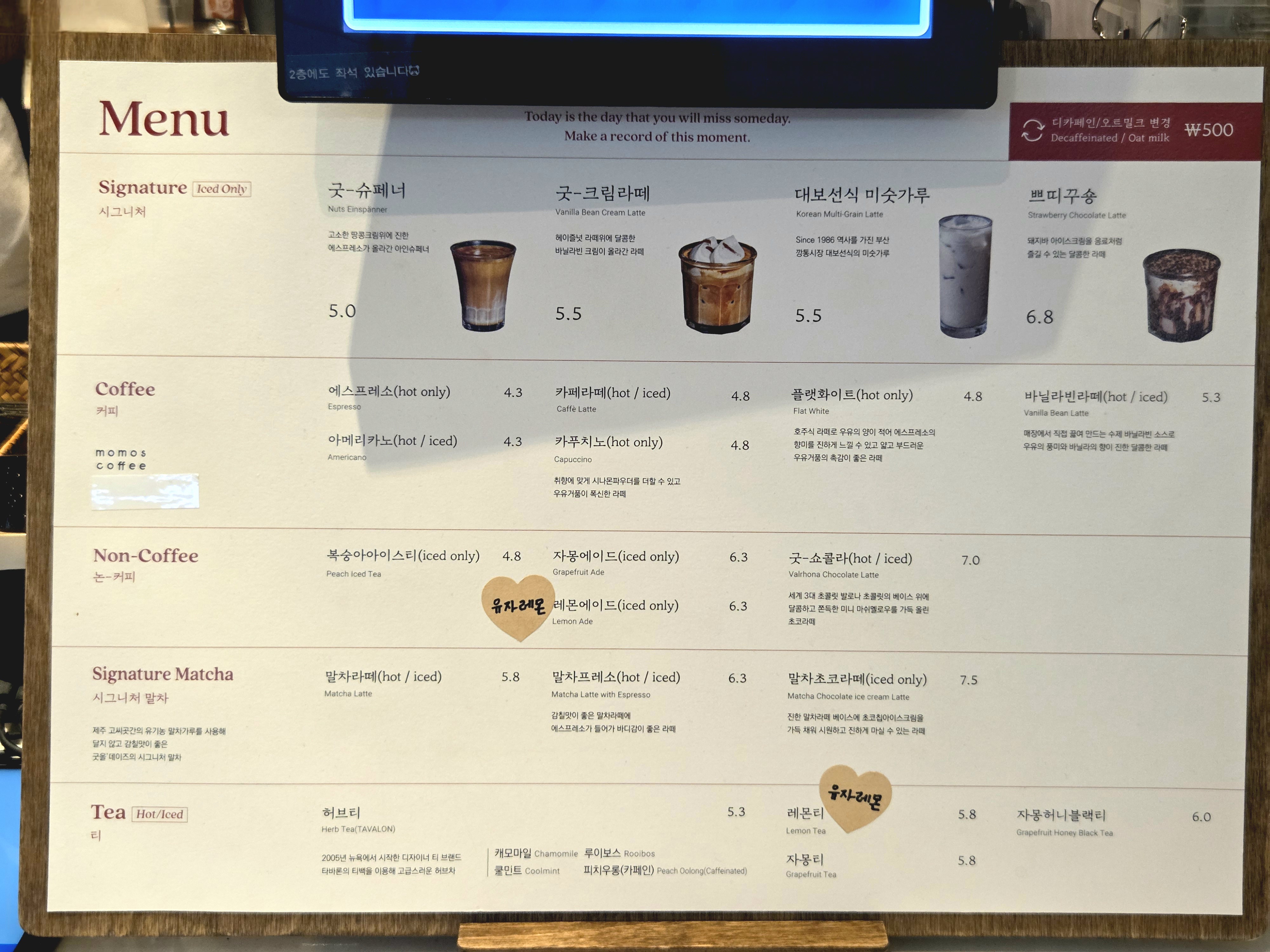 주문대 앞에 서서 고민 끝에 카페의 시그니처 메뉴인 굿-슈페너와 굿-크림라떼, 그리고 황치즈케이크를 주문했습니다.