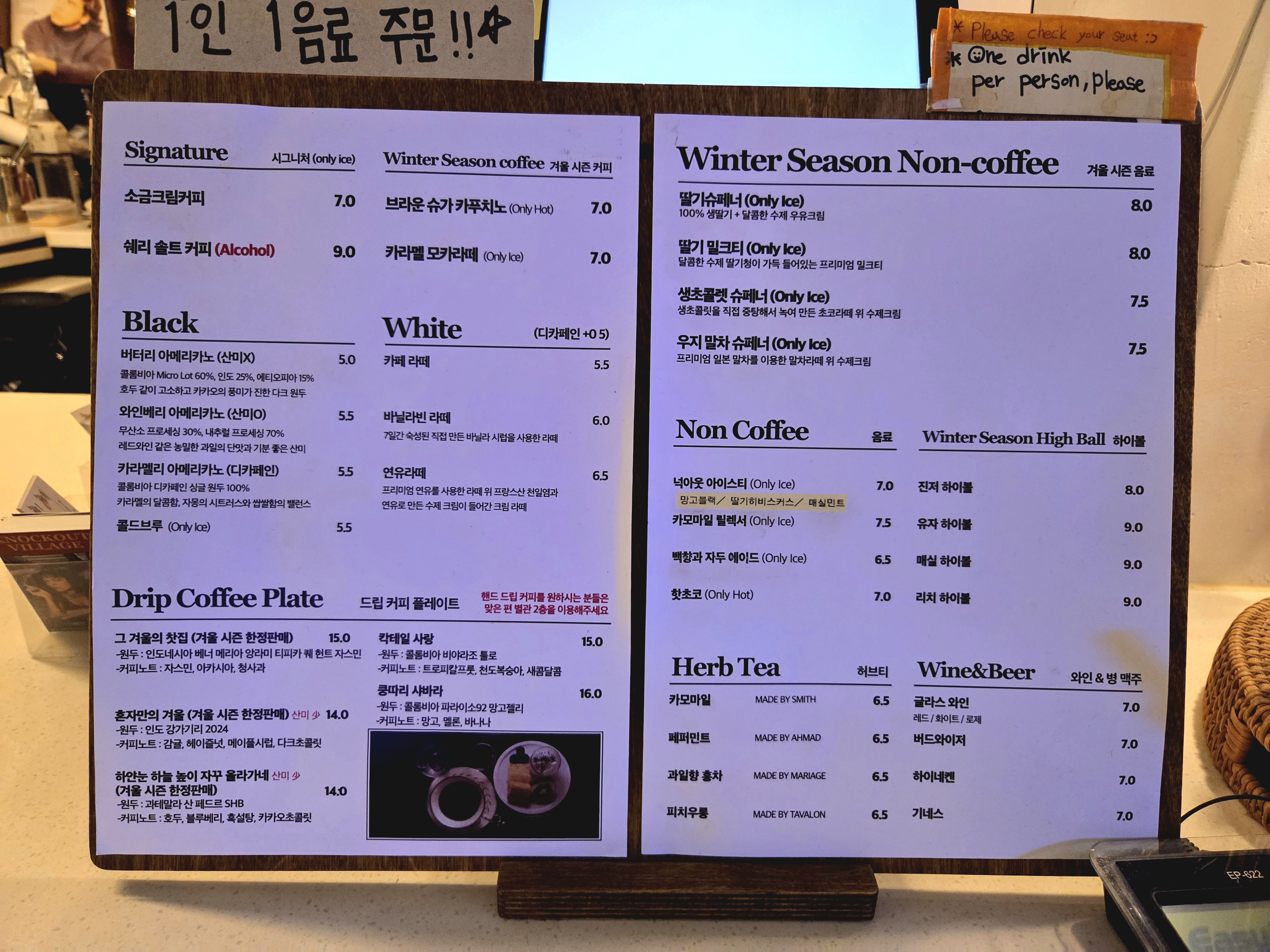우리는 와인베리커피와 백향과자두에이드를 주문하고, 가파른 계단을 올라 2층으로 향했습니다. 이곳은 기존의 주택 구조를 살려 공간이 분리되어 있었는데, 덕분에 다른 손님들과 적당한 거리를 유지하며 대화할 수 있었습니다.