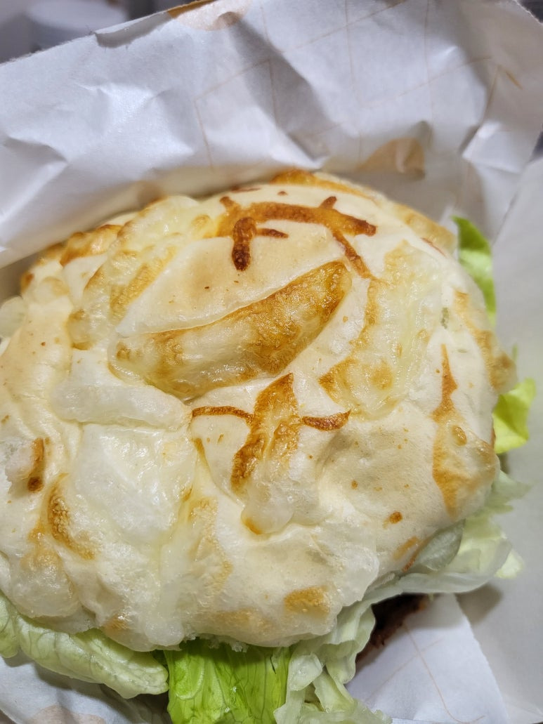 일반적인 햄버거 번이 아니라 '브리오쉬 번'이 사용되었는데요. 이 번 위에는 모짜렐라 치즈와 체다 치즈가 녹아 있어 고소하고 쫀득한 식감이 아주 매력적이었습니다.